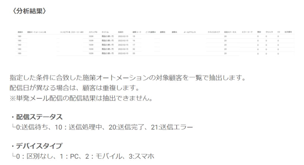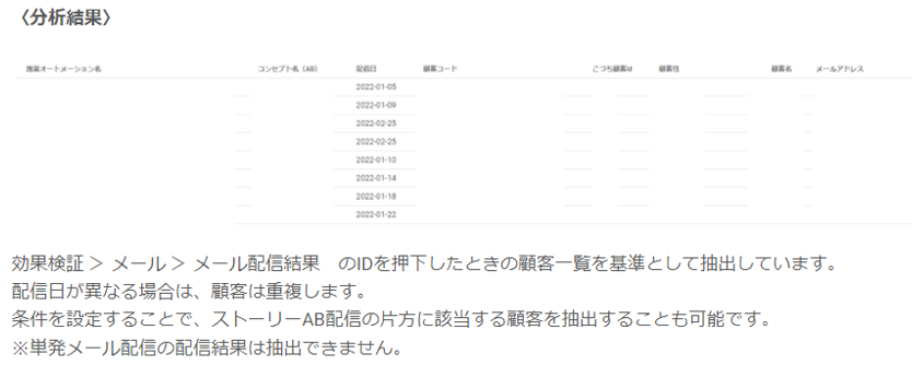 メールIDごとに開封した顧客情報(顧客コード・氏名・性別・生年月日)を一覧で表示し、顧客の属性や行動時間を分析することができます。