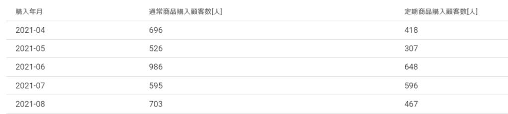 月毎の通常商品購入顧客数と、定期商品購入顧客数を確認することができます。