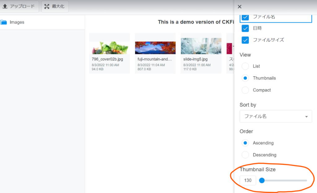 設定メニュー最下部でサムネイルサイズを設定できます。