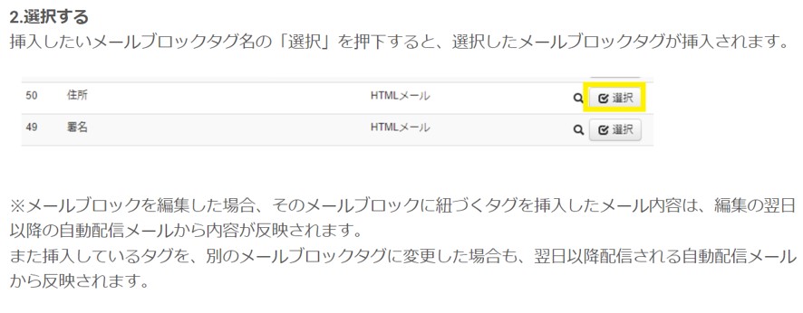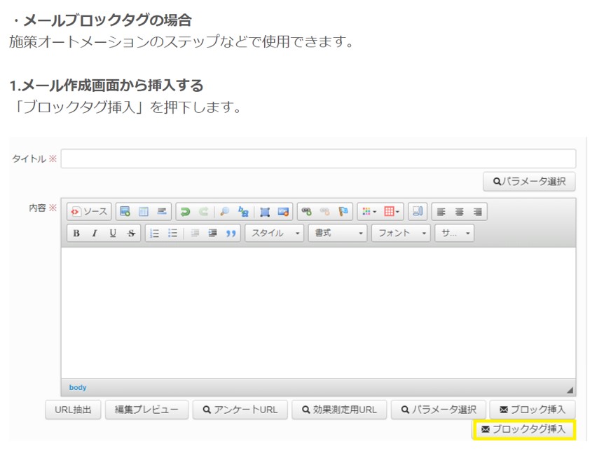 メールブロックタグは、保存したテンプレートをタグに変換して本文に挿入する仕組みとなっており、テンプレート内容を変更した際、メール本文には変更内容が自動的に反映されるようになっています。