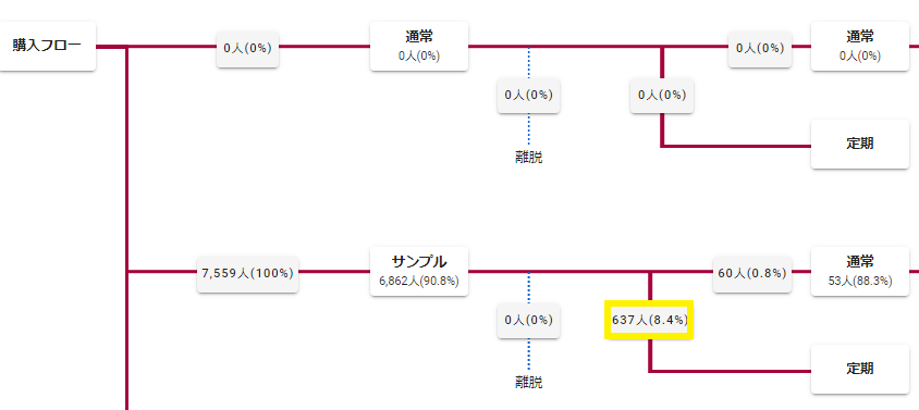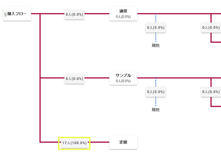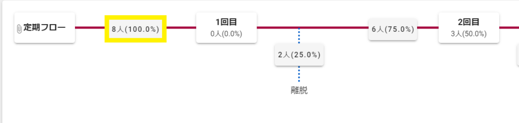 フロー図が表示されるので、「定期フロー」からF2離脱率を確認できます。(黄色枠)