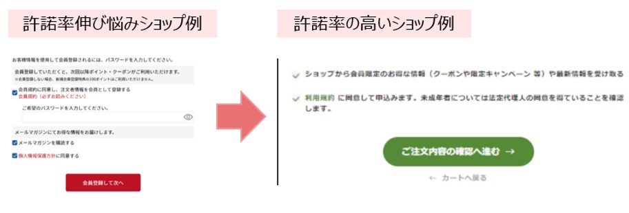 メール許諾画面での文言を直接的なもの(メールマガジンを購読する)から、お客様にメリットがある表現(お得情報やクーポン)に表記を変更することで許諾率が向上した例です。