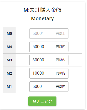 「Mチェック」を押下した後に、平均累計購入金額と最大累計購入金額が表示されます。