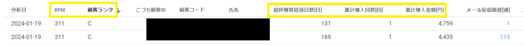 「RFM・顧客ランク・最終購買経過日数・累計購入回数・累計購入金額」(上図黄枠)