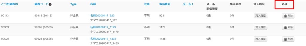 赤枠内の「処理」の欄より、削除したい顧客の「削除」ボタンを押下
