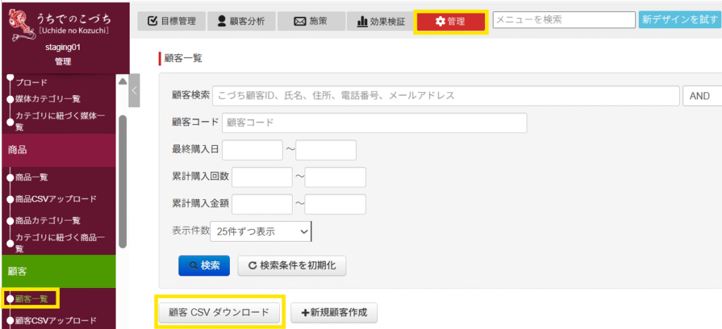 管理 > 顧客 > 顧客一覧 にて