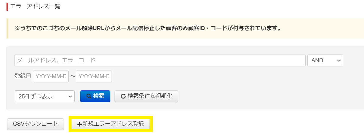 ・「+新規エラーアドレス登録」を押下し、エラーアドレス登録画面に移動